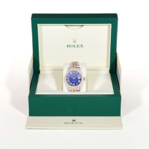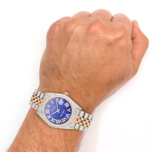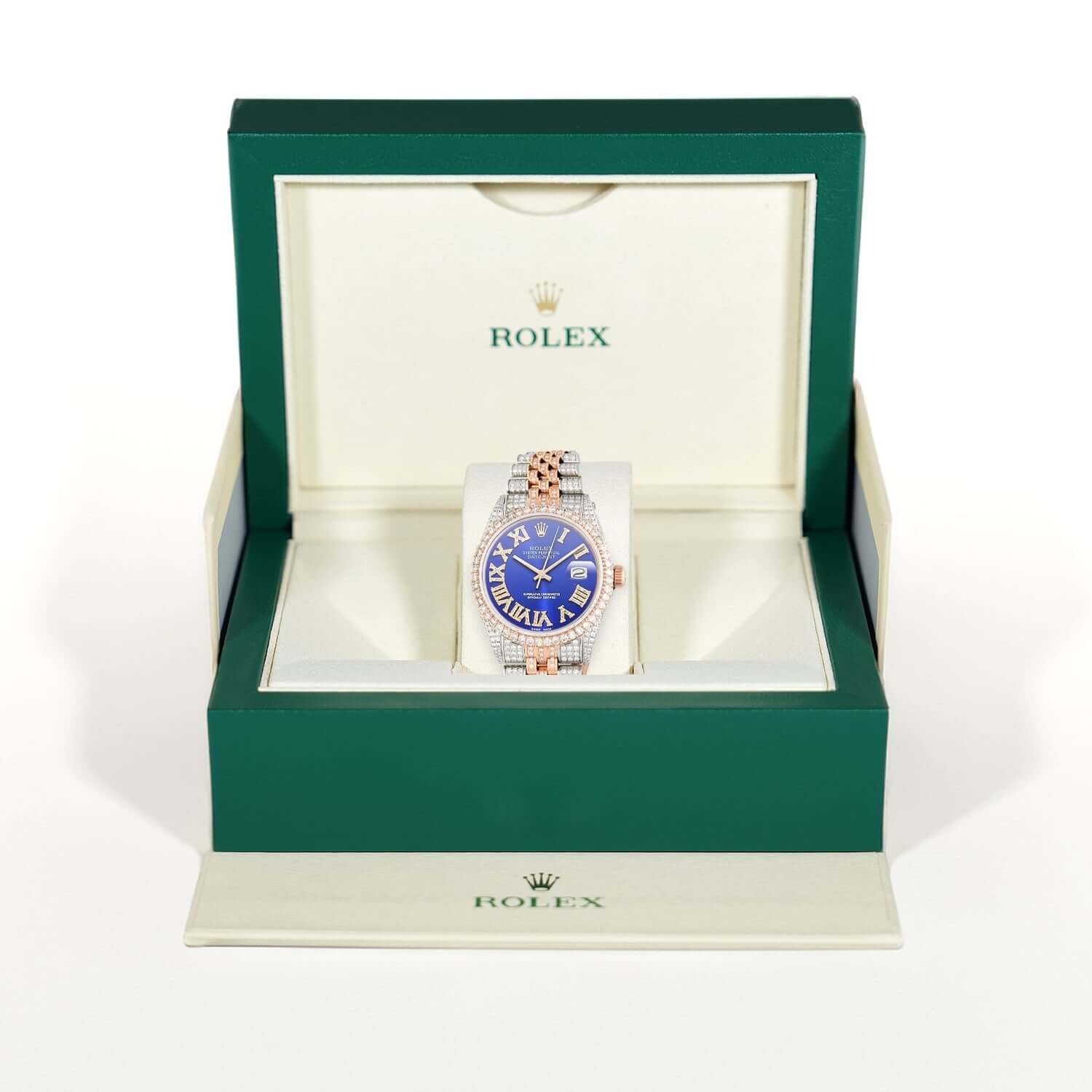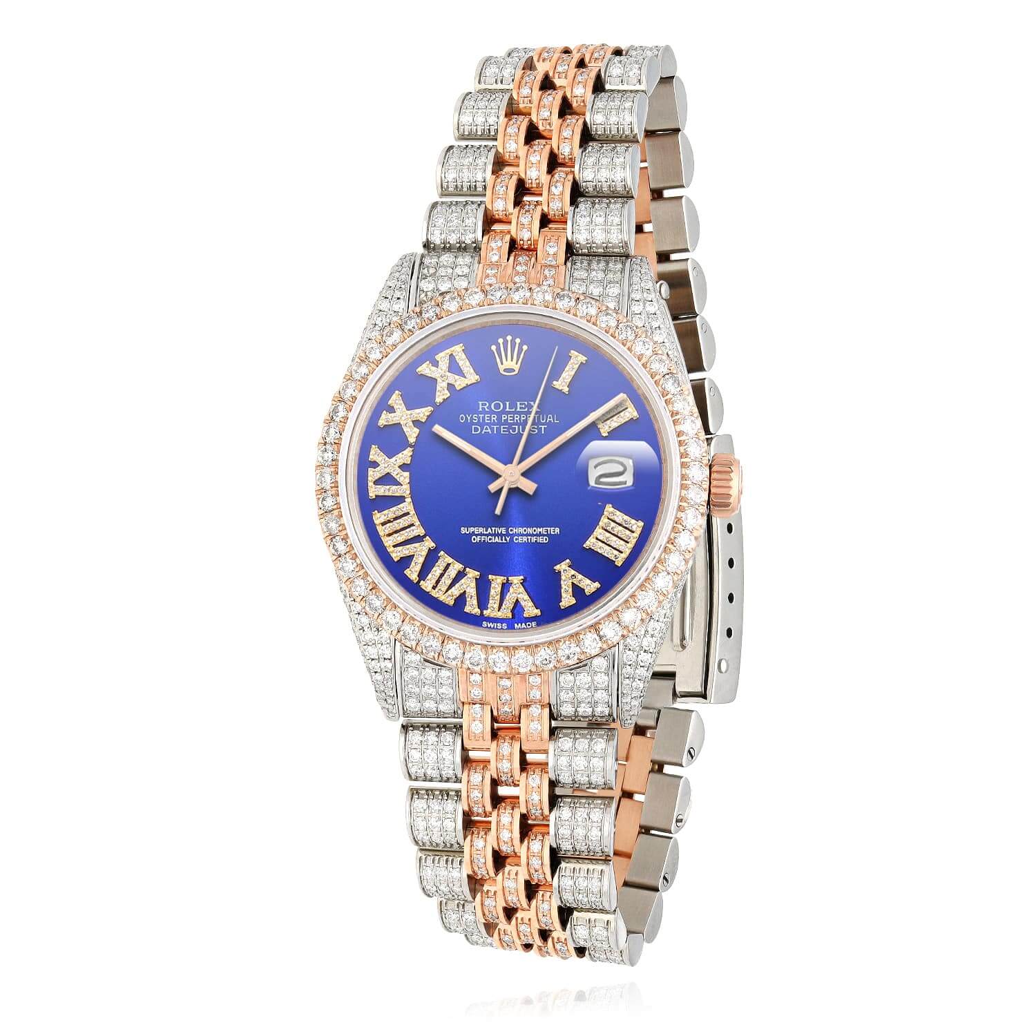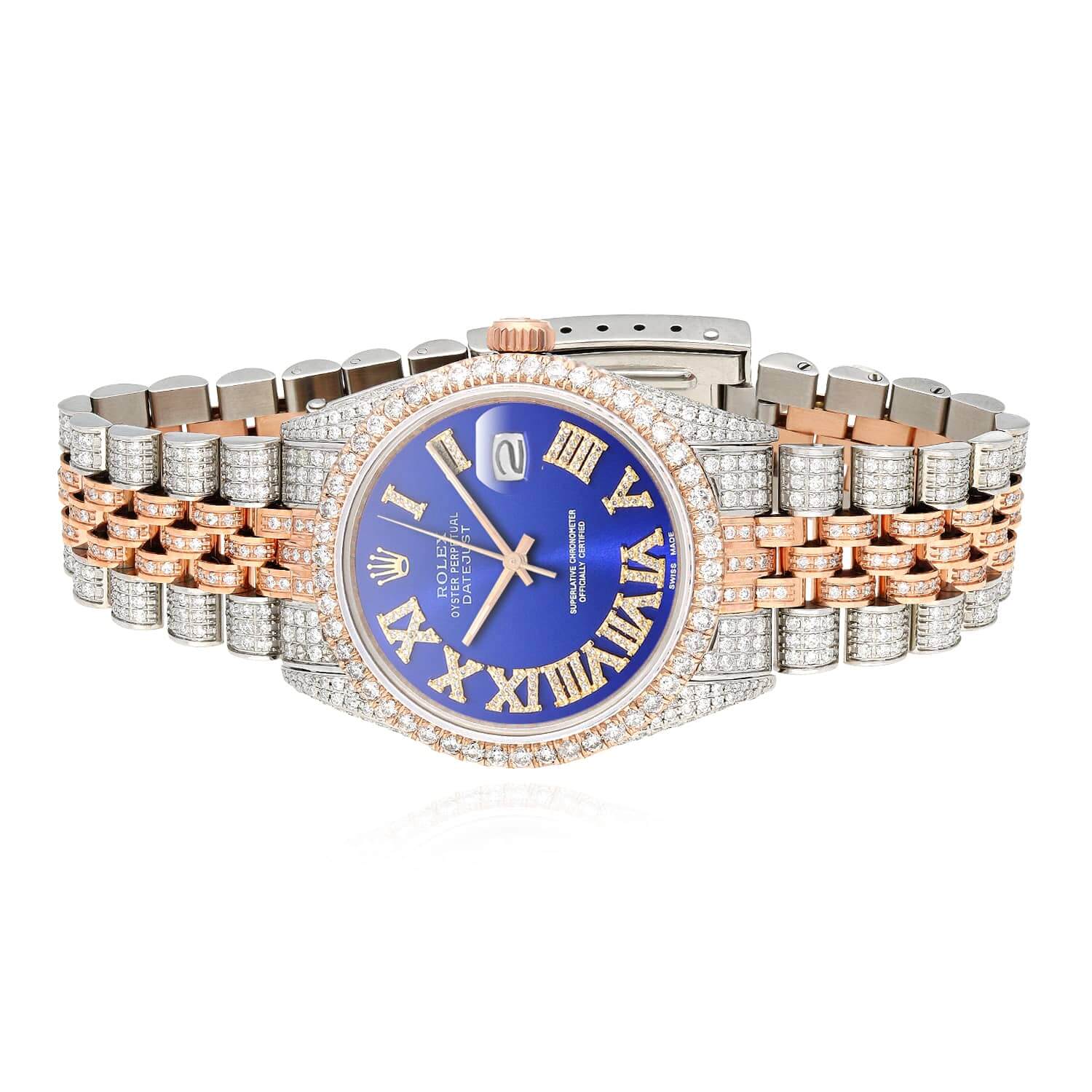 This pre-owned Rolex Datejust features a 36mm stainless steel case with a 12-carat diamond-set bezel and bracelet. The blue dial is accented with gold diamond Roman numerals, paired with a rose-tone Jubilee band for a bold yet elegant finish. Powered by a Swiss self-winding movement, this timepiece blends precision with style. Includes original box and certification. Released in the 1990s, this Rolex has been professionally polished and remains in excellent condition. Fits wrists up to 7.25 inches, with additional links available for purchase.