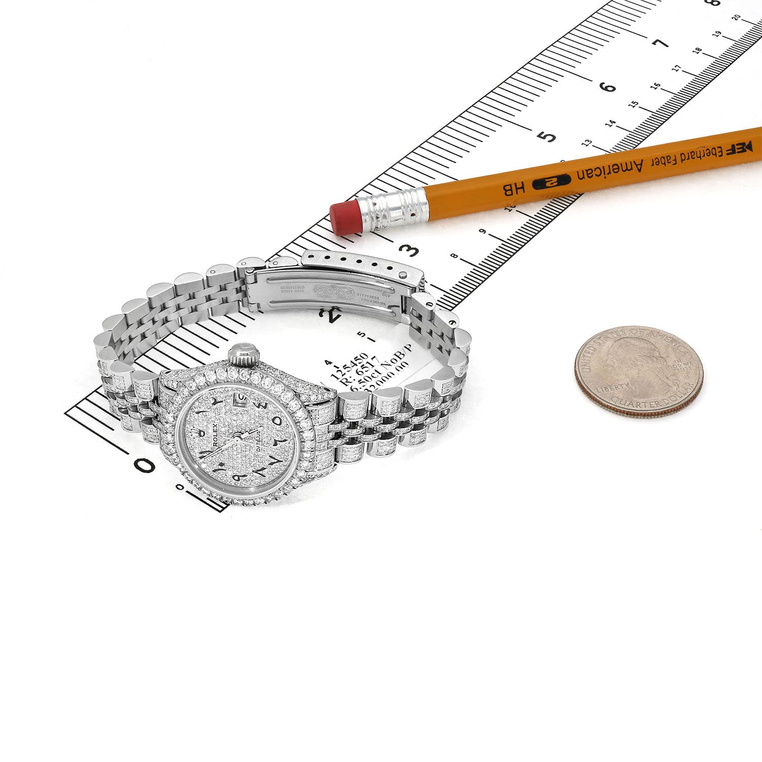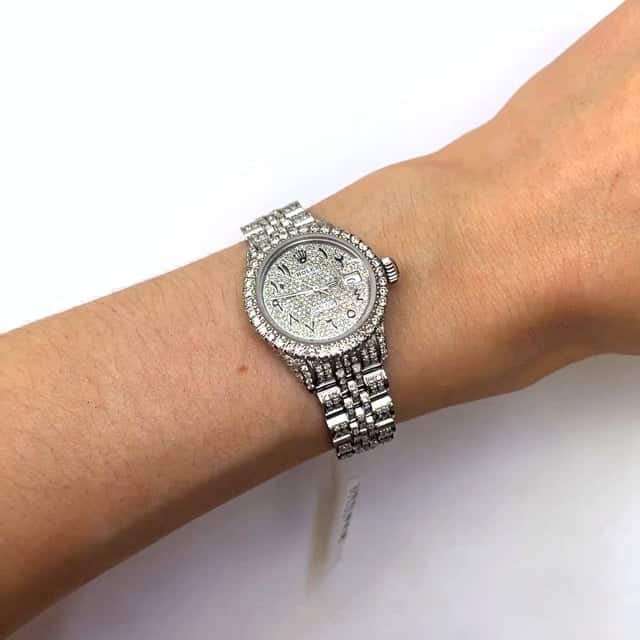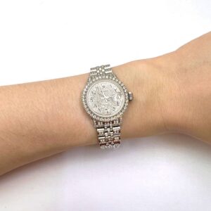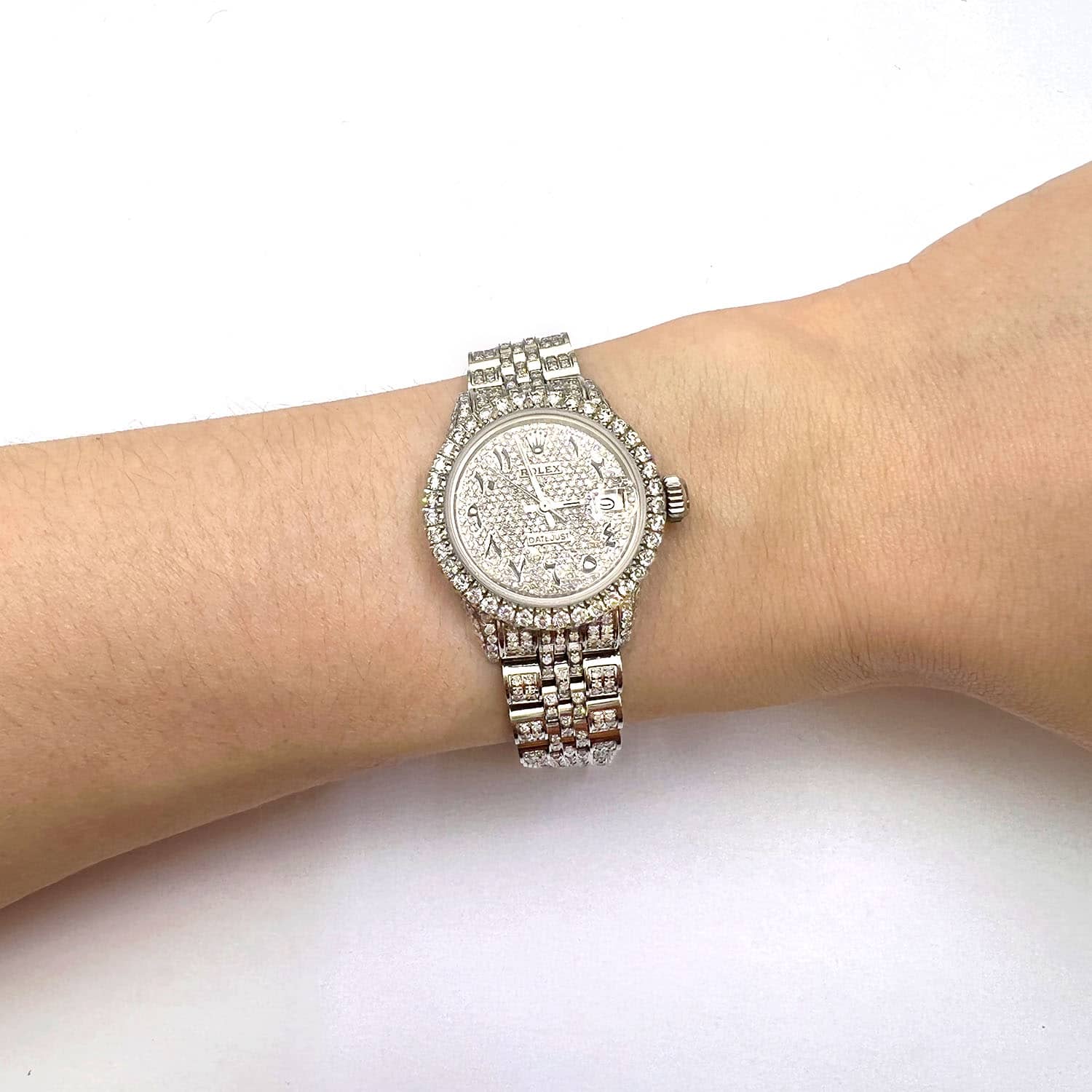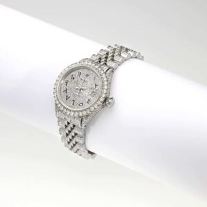 This pre-owned Rolex Datejust 26mm watch features a stainless steel case with a diamond-set bezel, a full white diamond pave dial with black Arabic numerals, and a certified aftermarket custom diamond Jubilee bracelet. A rare luxury timepiece released in the 1990s, it comes with the original box and certification. Please note: custom diamond additions render this watch non-waterproof. Handle with care. All specifications are approximate.