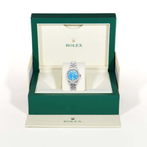 This pre-owned Rolex Datejust features a 26mm stainless steel case with a diamond bezel and a sky-blue dial set with diamond markers. It runs on a Swiss perpetual self-winding movement and is fitted with a certified aftermarket Jubilee bracelet. Includes original box and certification. This ladies Rolex watch, released in the 1990s, is a stunning expression of luxury and timeless style.