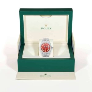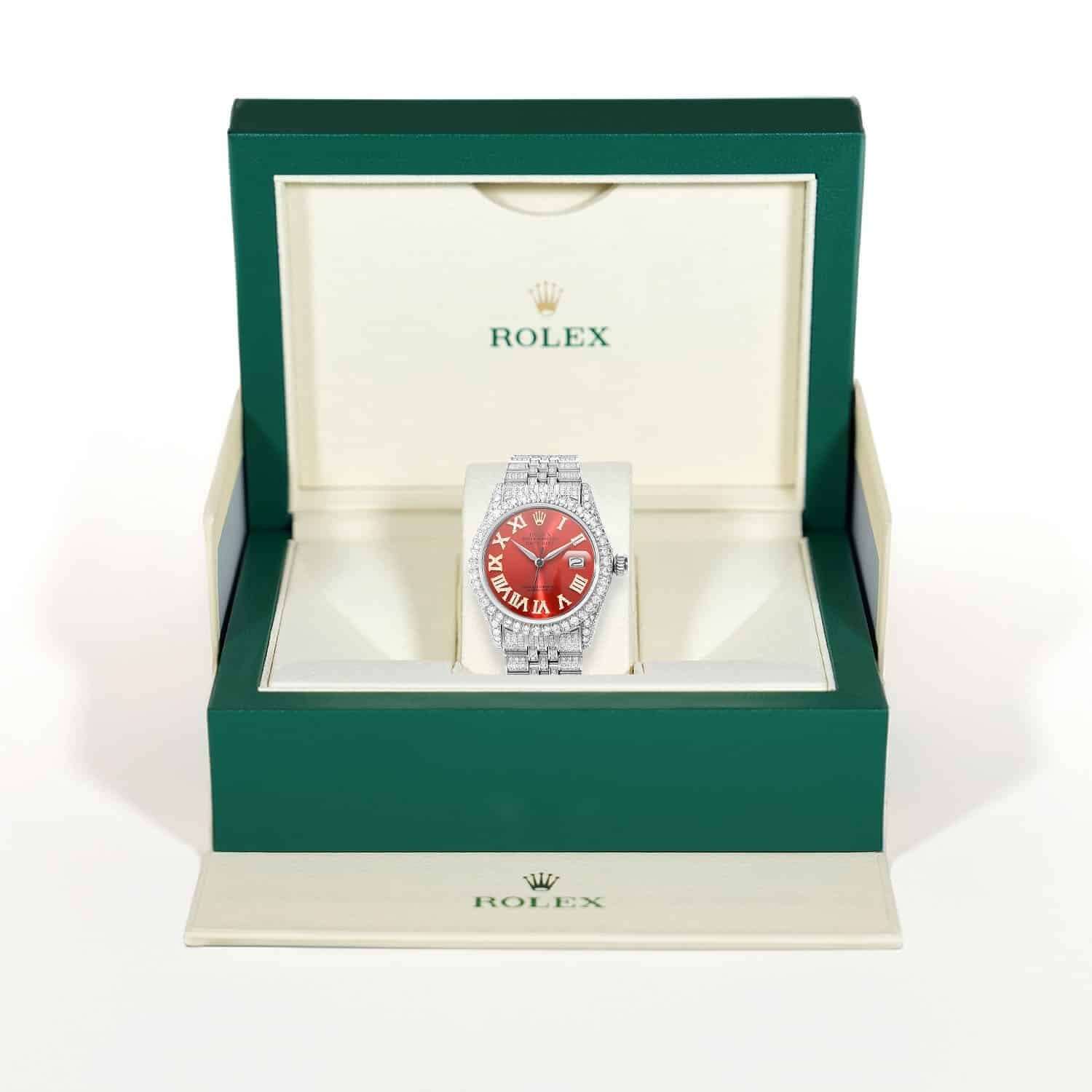 Embrace opulence with this pre-owned Rolex Datejust 1601, featuring a rich ruby red dial, diamond Roman numerals, and a diamond pave Jubilee band that radiates luxury and timeless allure. This Rolex was released in the 1990s and remains a beautiful symbol of sophistication and style. Fits wrists up to 7.25 inches with removable links (extra links available upon request).