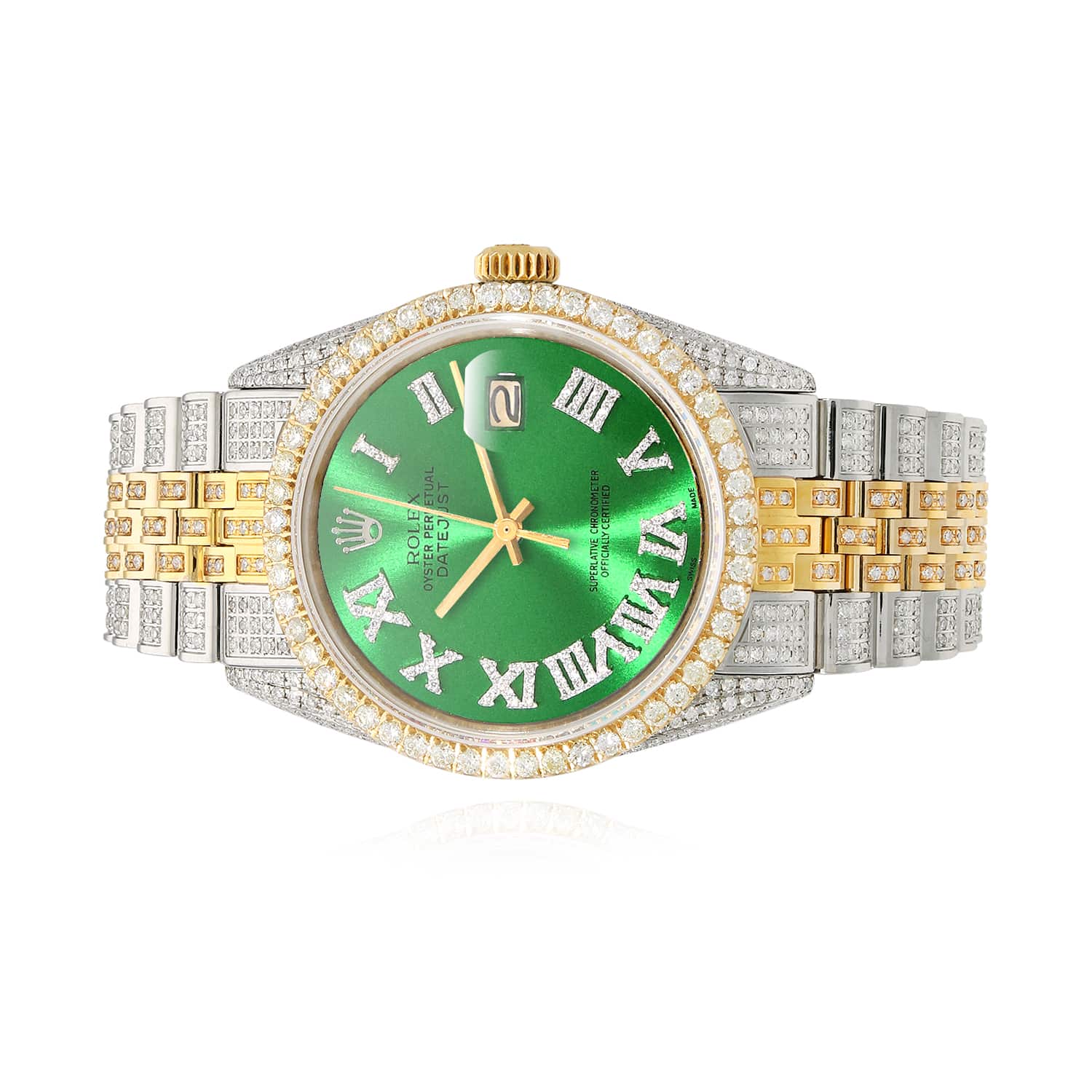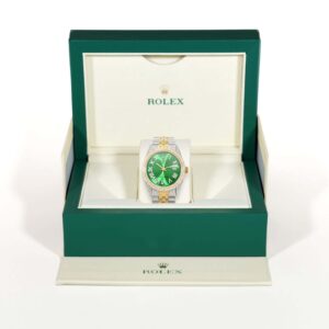 This Rolex Datejust 36mm features a vibrant emerald green dial with diamond Roman numerals and a custom diamond bezel. The two-tone Jubilee bracelet with a certified aftermarket band completes its refined design. Pre-owned and released in the 1990s, it remains in excellent condition and comes with its original box and certification. Fits wrists up to 7.25 inches with removable links. Extra links available upon request.