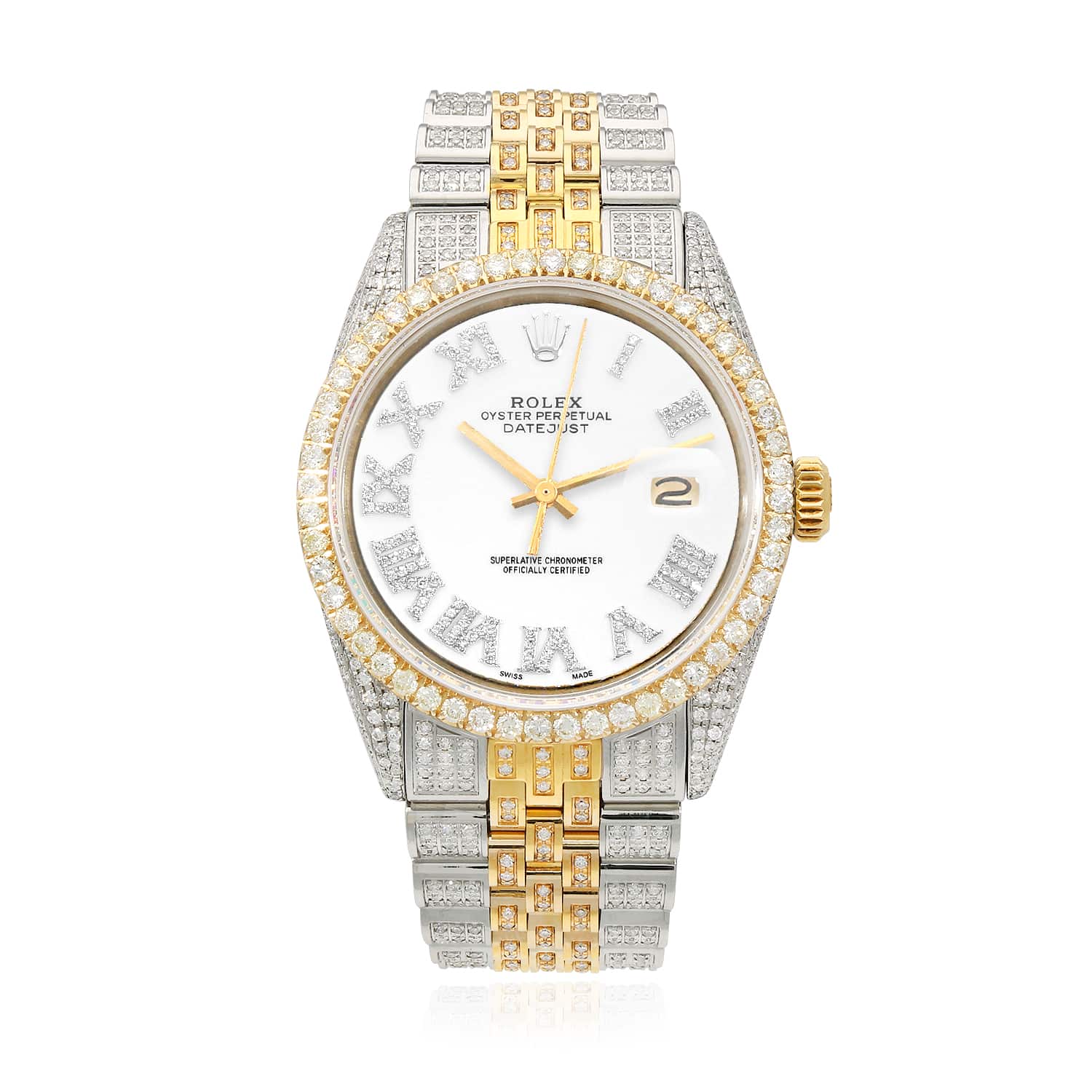 This Rolex Datejust 36mm features a white dial with diamond Roman numerals and a custom white gold diamond bezel. Paired with a two-tone Jubilee bracelet, it combines timeless design with luxury craftsmanship. Powered by a Swiss self-winding movement, this pre-owned model is in immaculate condition and comes with its original box and certification. Released in the 1990s. Fits wrists up to 7.25 inches with removable links. Extra links available upon request.