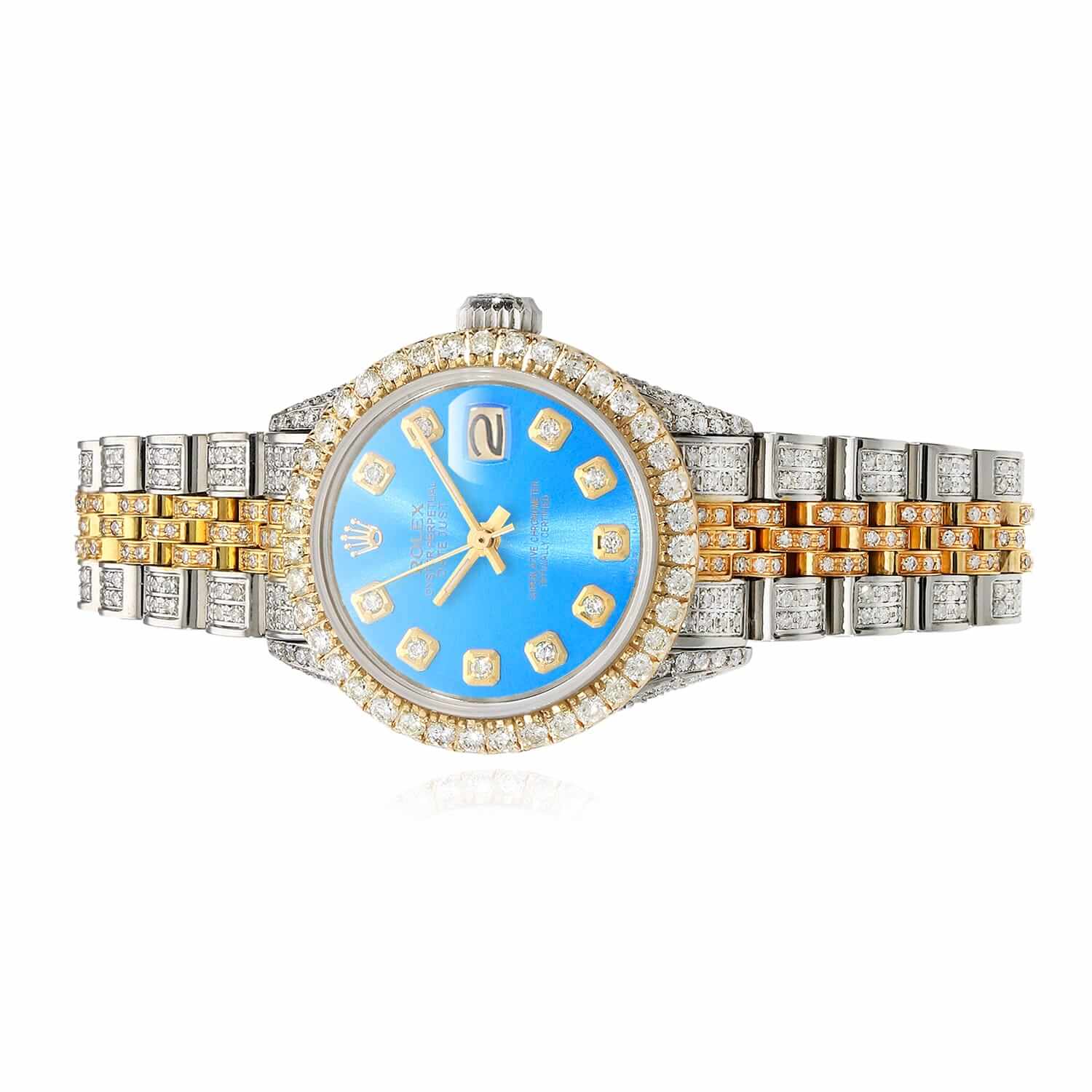 This pre-owned Rolex Datejust features a custom diamond Jubilee band and bezel, complemented by a sky-blue dial with diamond dot markers. Crafted from stainless steel and 18K yellow gold with a high-polished finish, it runs on a self-winding Swiss movement. Includes original box and certification. Released in the 1990s, this Rolex remains a timeless statement of elegance and luxury.