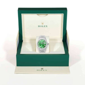 Showcasing an emerald green dial with white diamond Roman numerals and a lavish 9.5Ct diamond bezel, this Rolex Datejust is a striking blend of craftsmanship and luxury. The stainless steel Jubilee band with a grey finish adds a modern touch to its timeless elegance. This pre-owned ladies Rolex is in excellent condition, polished to retain its original finish. Released in the 1990s, it fits wrists up to 7.25 inches with removable links (extra links available upon request).