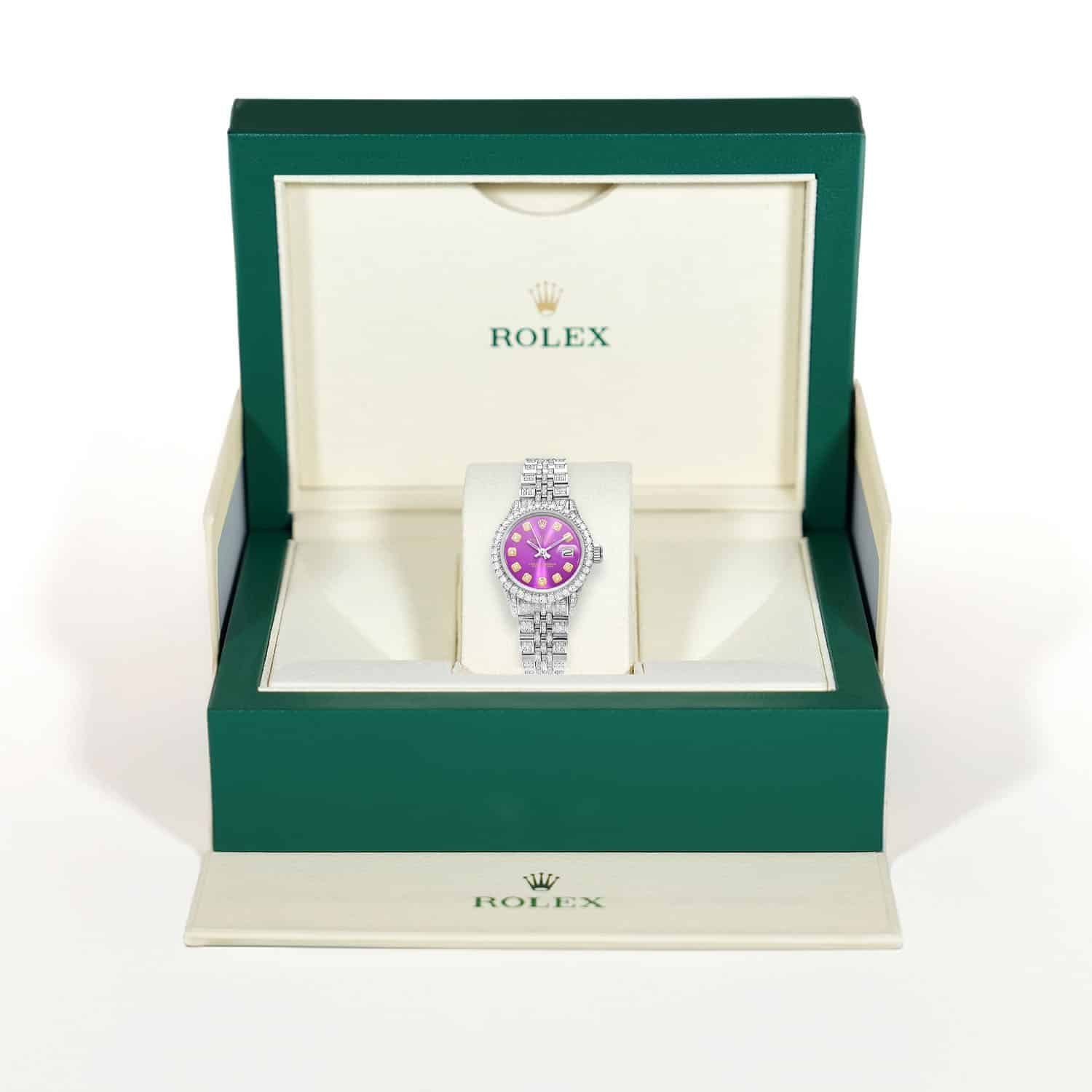 This certified pre-owned Rolex Datejust features a striking purple dial with diamond markers, a 26mm stainless steel case with a custom diamond bezel, and a diamond pave Jubilee bracelet. Set with 6 carats of natural diamonds, the watch is crafted from high-polished stainless steel and comes with the original box and certification. Released in the 1990s, this ladies Rolex Datejust is a timeless expression of luxury and elegance.
