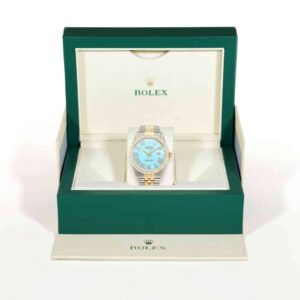 Experience luxury with this pre-owned Rolex Datejust 16013, featuring a captivating turquoise blue dial with diamond Roman numerals and a 4.5Ct diamond-set bezel. A timeless design with two-tone Jubilee bracelet, combining elegance and precision. This Rolex was released in the 1990s and remains in immaculate condition, with the bracelet straps lightly polished to retain the original finish. Fits wrists up to 7.25 inches with removable links (extra links available upon request).