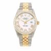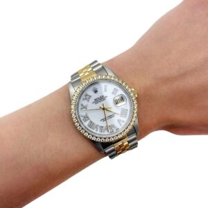 Experience timeless elegance with the Rolex Datejust 36mm featuring a Jubilee band and custom diamond bezel. The white-on-white dial, accented by diamond-set Roman numerals, complements the high-polished stainless steel case. This pre-owned Rolex Datejust comes from our inventory and it’s always kept clean and ready for wear. This example is in immaculate condition and the bracelet straps have been lightly polished to retain the original finish. This Rolex was released in the 1990s. Fits wrists up to 7.25 inches with removable links. Additional links are available for purchase to extend the bracelet.