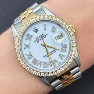 Please note: Customizations, including diamond additions to the bezel, render this Rolex watch non-waterproof. Handle with care!
