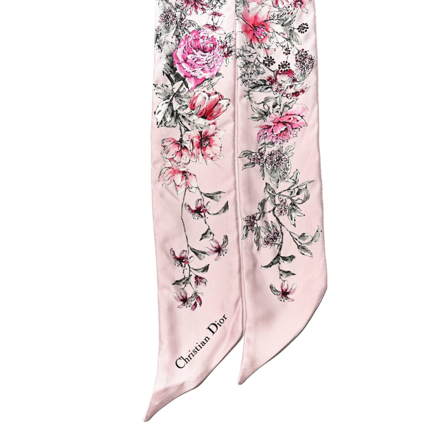 This is an authentic CHRISTIAN DIOR Silk Floral Mitzah Scarf in Rose. This 100% silk scarf features a colorful floral design on a pink background on one side, and a large Christian Dior logo in pink and white on the reverse.