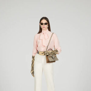 A structured GthtG Supreme canvas top handle bag appears beige and ebony with subtle taupe suede trim. The textured tiger head closure defines the front as a unique hardware detail.
