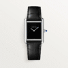 Tank Américaine watch, small model, quartz movement. Steel case. Faceted crown with a faceted synthetic blue spinel. Silvered satin-brushed dial, blued-steel sword-shaped hands, sapphire crystal. Shiny blue alligator-skin strap, steel ardillon buckle. Case dimensions: 35.4 mm x 19.4 mm, thickness: 6.8 mm. Water-resistant up to 3 bar (approx. 30 meters/100 feet).