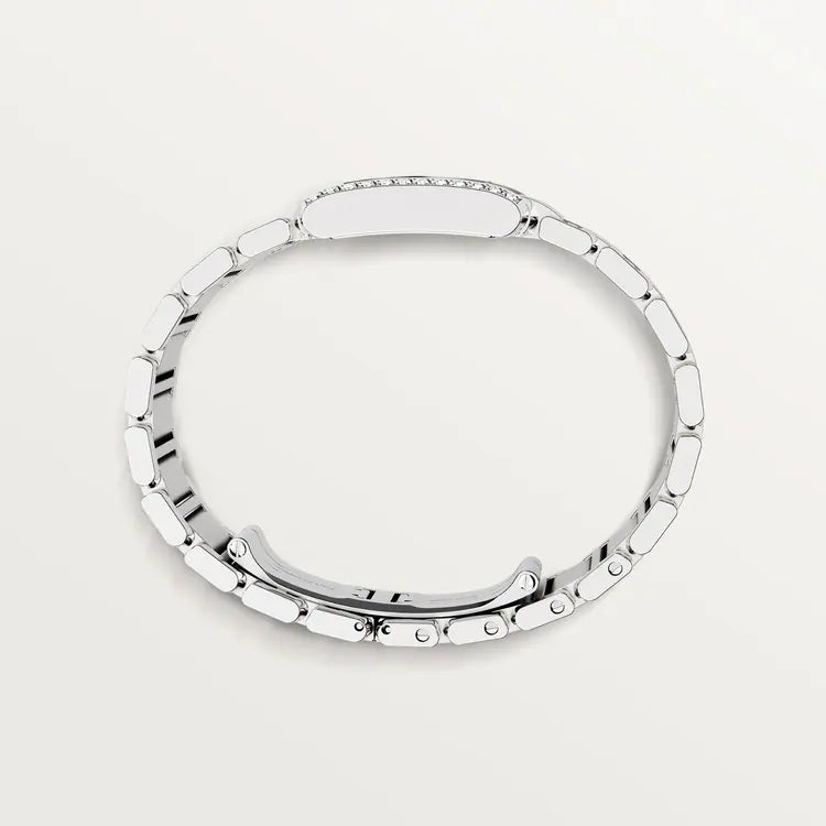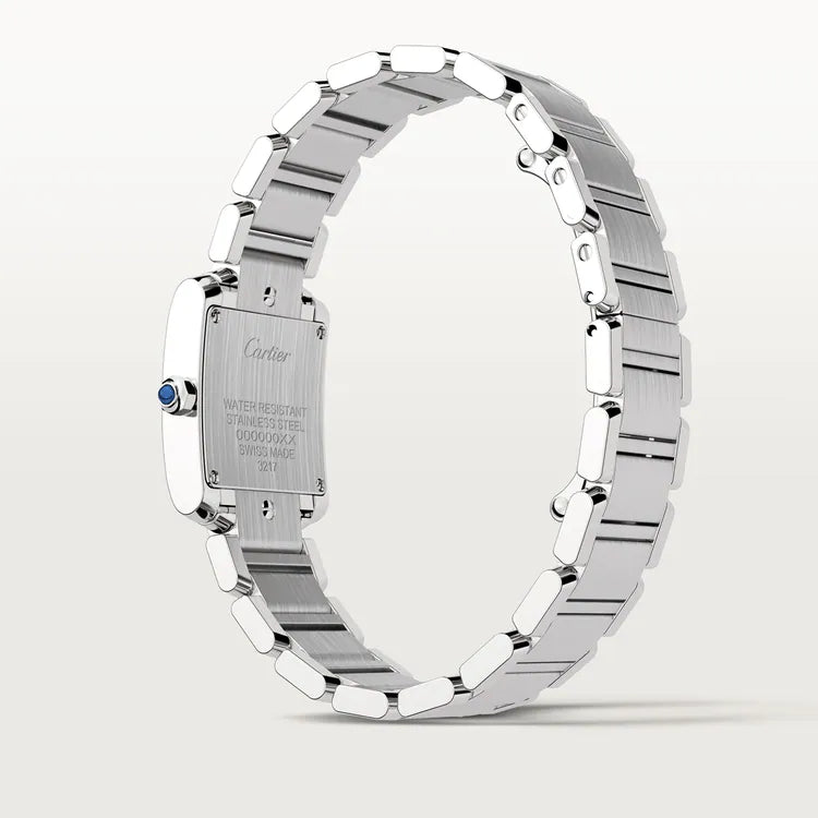 Tank Française watch, small model, quartz movement. Steel case set with 24 brilliant-cut diamonds totaling 0.49 carats. Faceted crown set with a synthetic cabochon-shaped spinel. SiLthtVered dial. Blued-steel sword-shaped hands. Sapphire crystal. Steel bracelet. Case dimensions: , thickness: 6.14 mm. Water-resistant up to 3 bar (approx. 30 meters/100 feet).