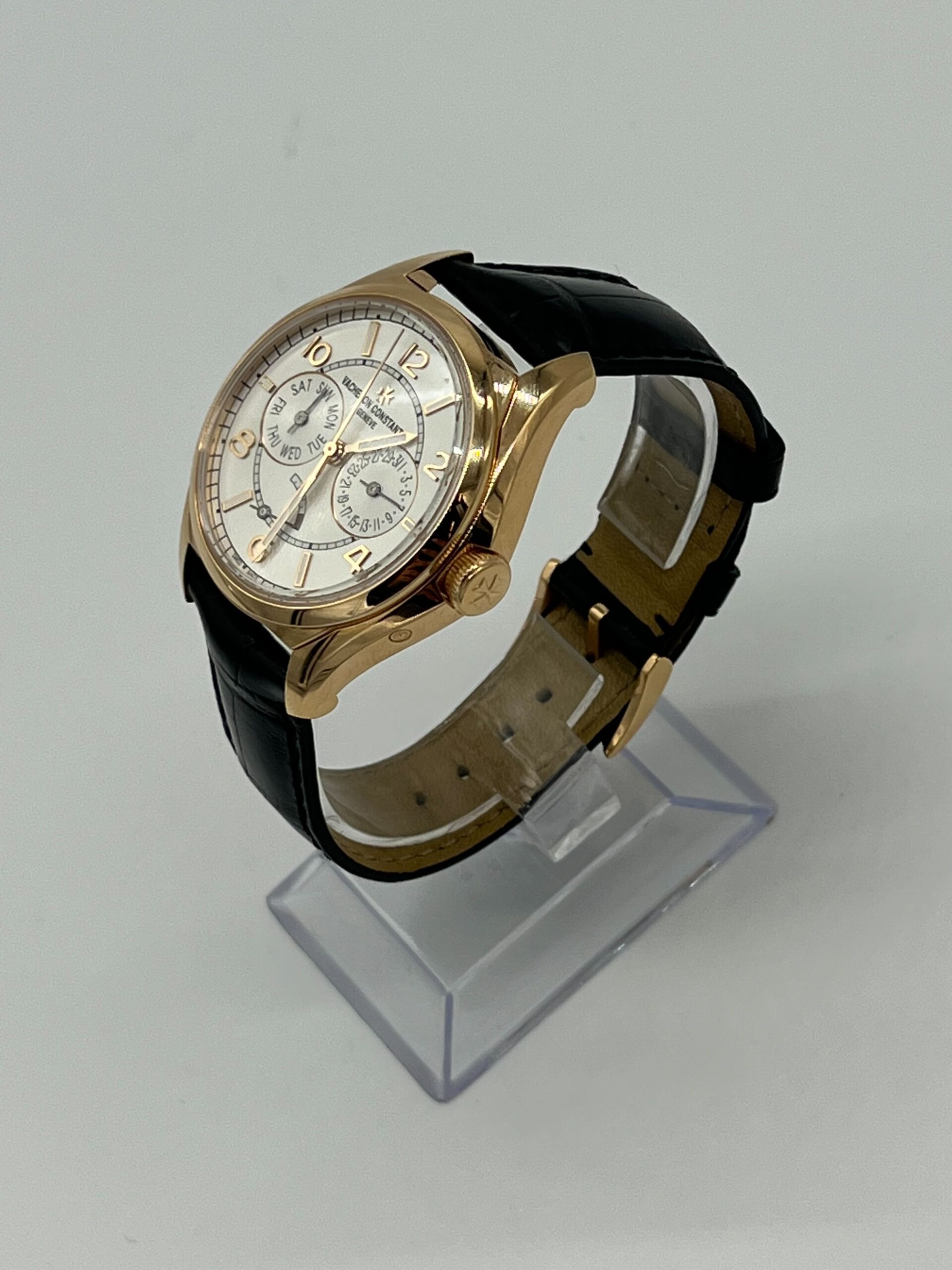This Vacheron Constantin features horns inspired by the sides of the Maltese cross, an integrated crown, and sapphire glass, this 18K pink gold watch honors a model from 1956. It displays the power reserve, a day-date indicator, and seconds on the dial. Its openworked caseback reveals an elevated oscillating weight in 22K gold, inspired by the Maltese cross.