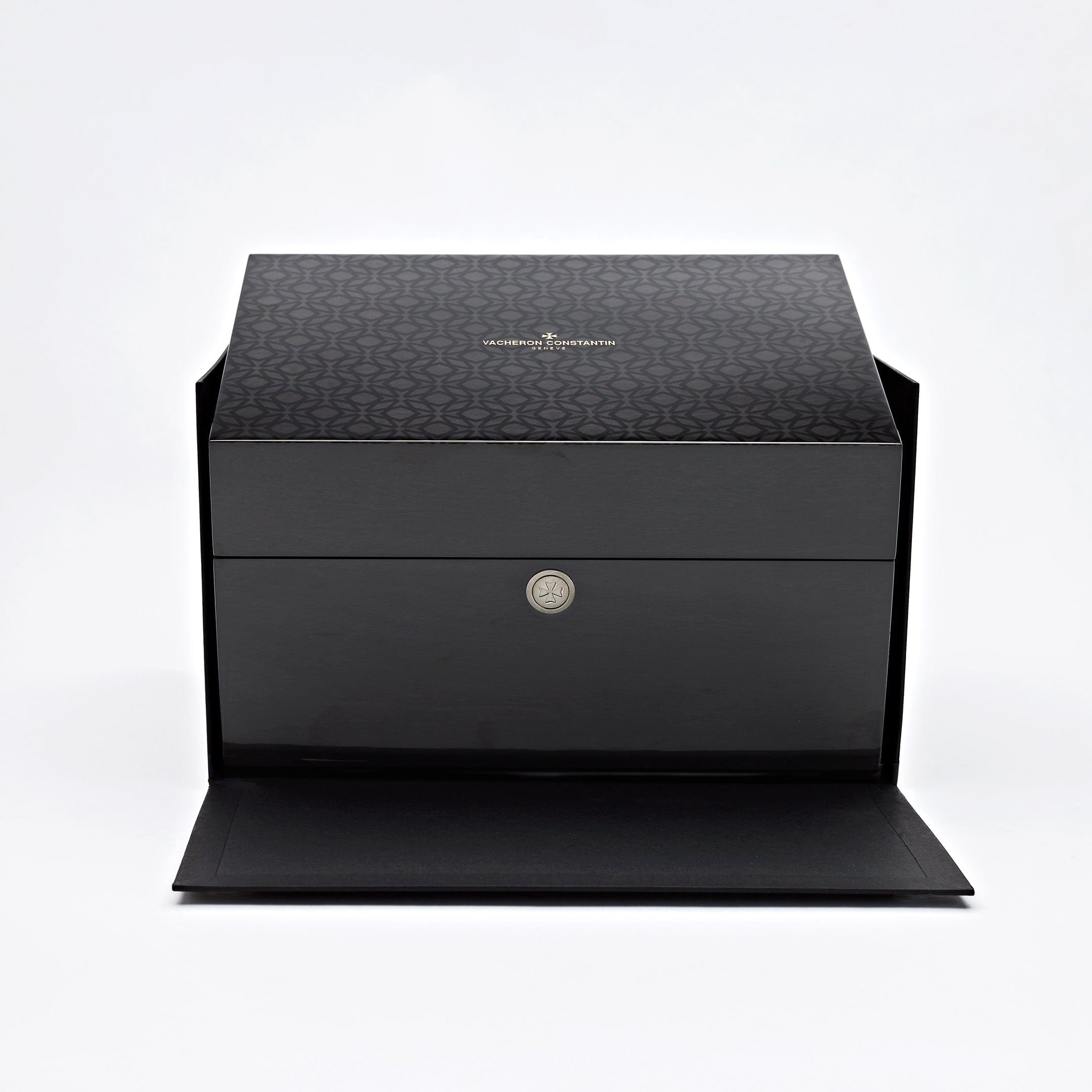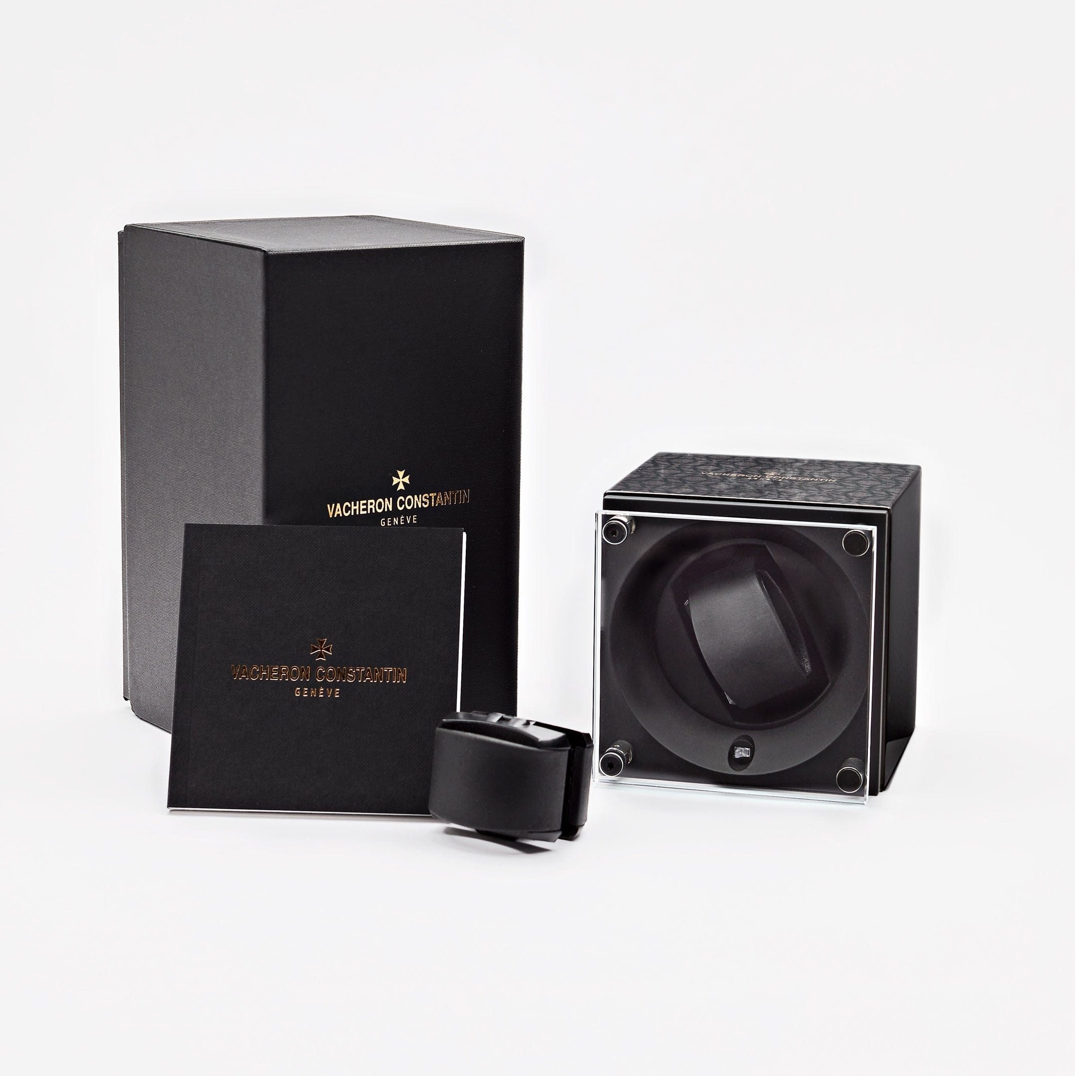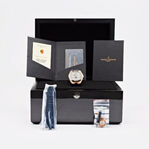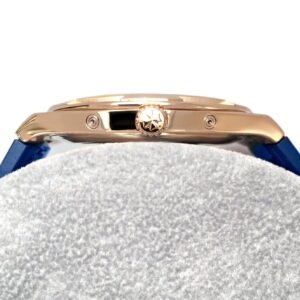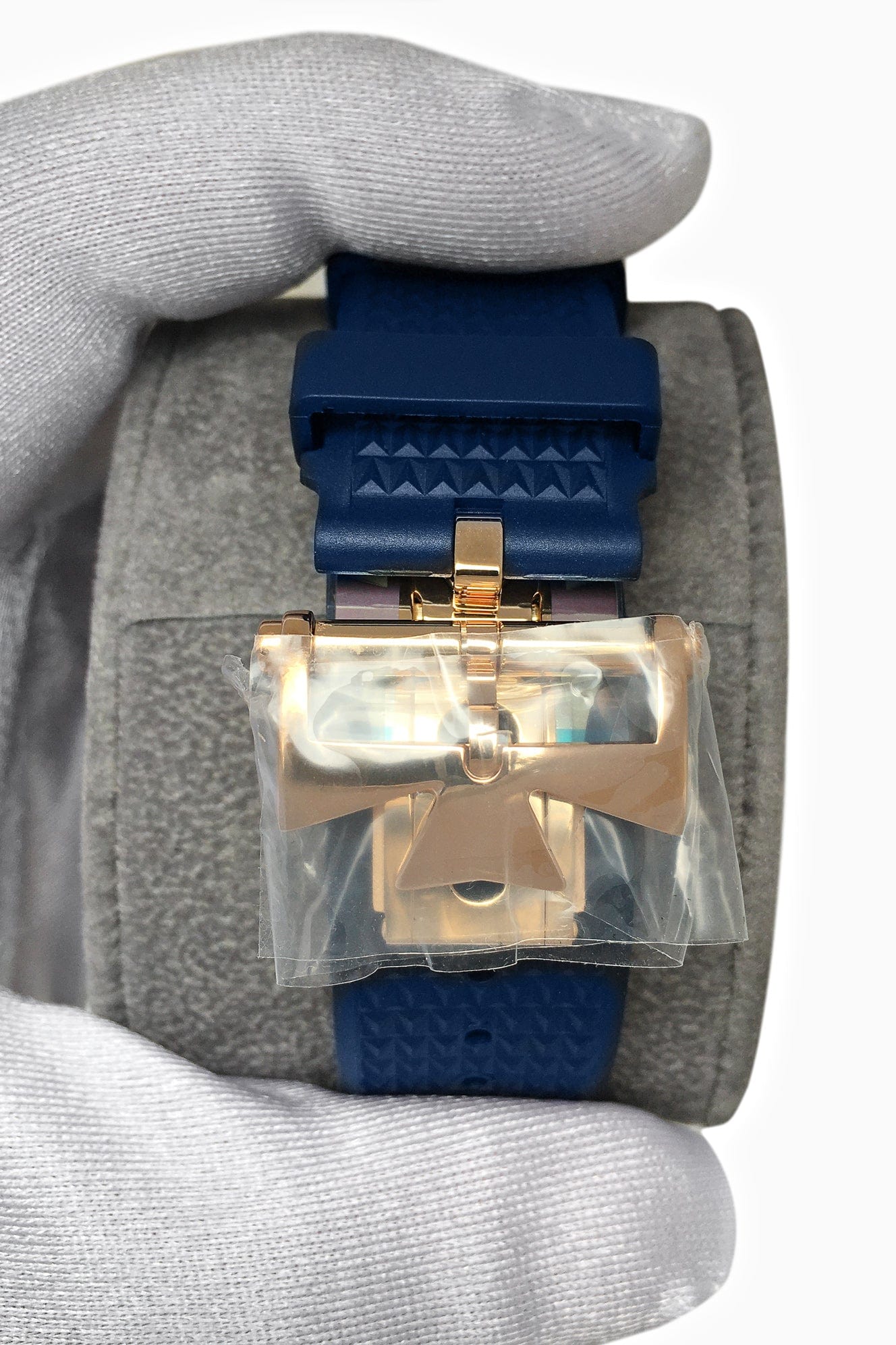 This Vacheron Overseas Perpetual Calendar 4300V/000R-B064 is crafted in a rose gold case measuring 41.5mm in diameter. The silver dial features four sub-dials, including moon phase, and rose gold applied hour markers. The watch comes on a blue rubber strap.