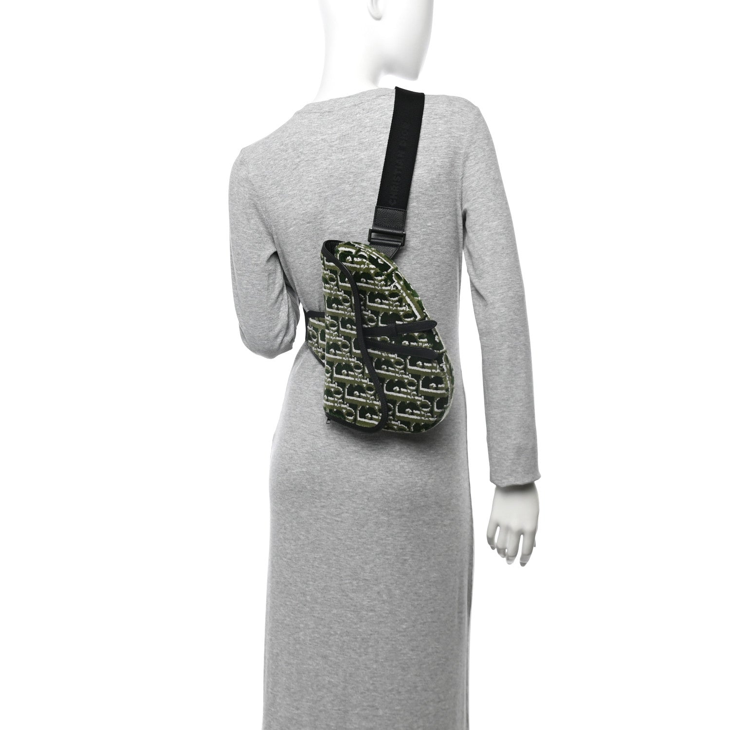 This is an authentic CHRISTIAN DIOR Velvet Oblique Mens Saddle Bag in Black and Green. This saddlebag is made of green Dior monogram. The bag features an adjustable shoulder strap in black Christian Dior jacquard with black grained calfskin trim and CD buckle. The flap of the bag opens to a zipper top with a black fabric interior.