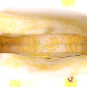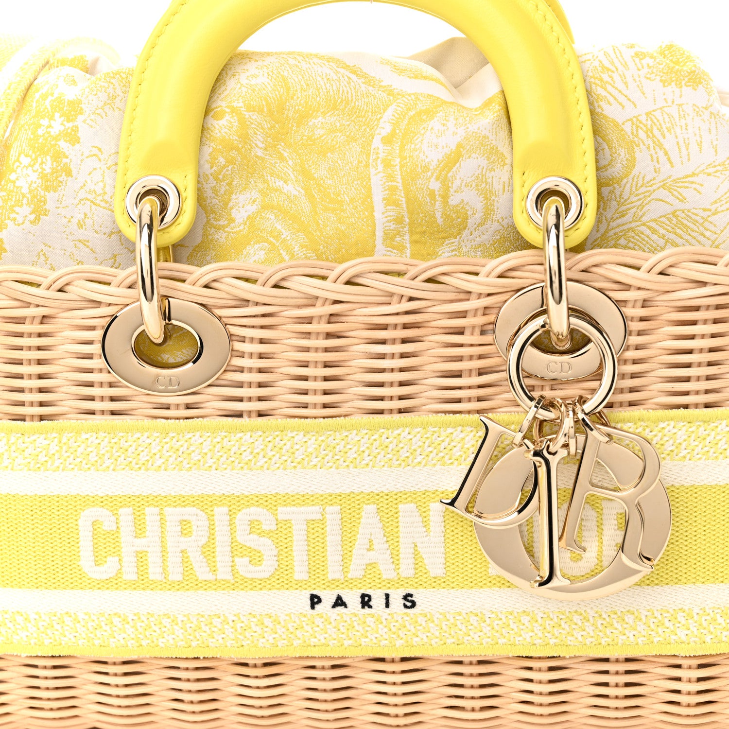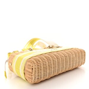 This is an authentic CHRISTIAN DIOR Wicker Oblique Dioriviera Medium Lady D-Joy Bag in Natural and Fluorescent Yellow. This bucket-style bag is crafted of Dior monogram canvas, beige wicker, and yellow leather trim. The bag features a leather top handles, an adjustable strap, and gold hardware. The top opens with a cinch cord to a fabric interior with a patch pocket.